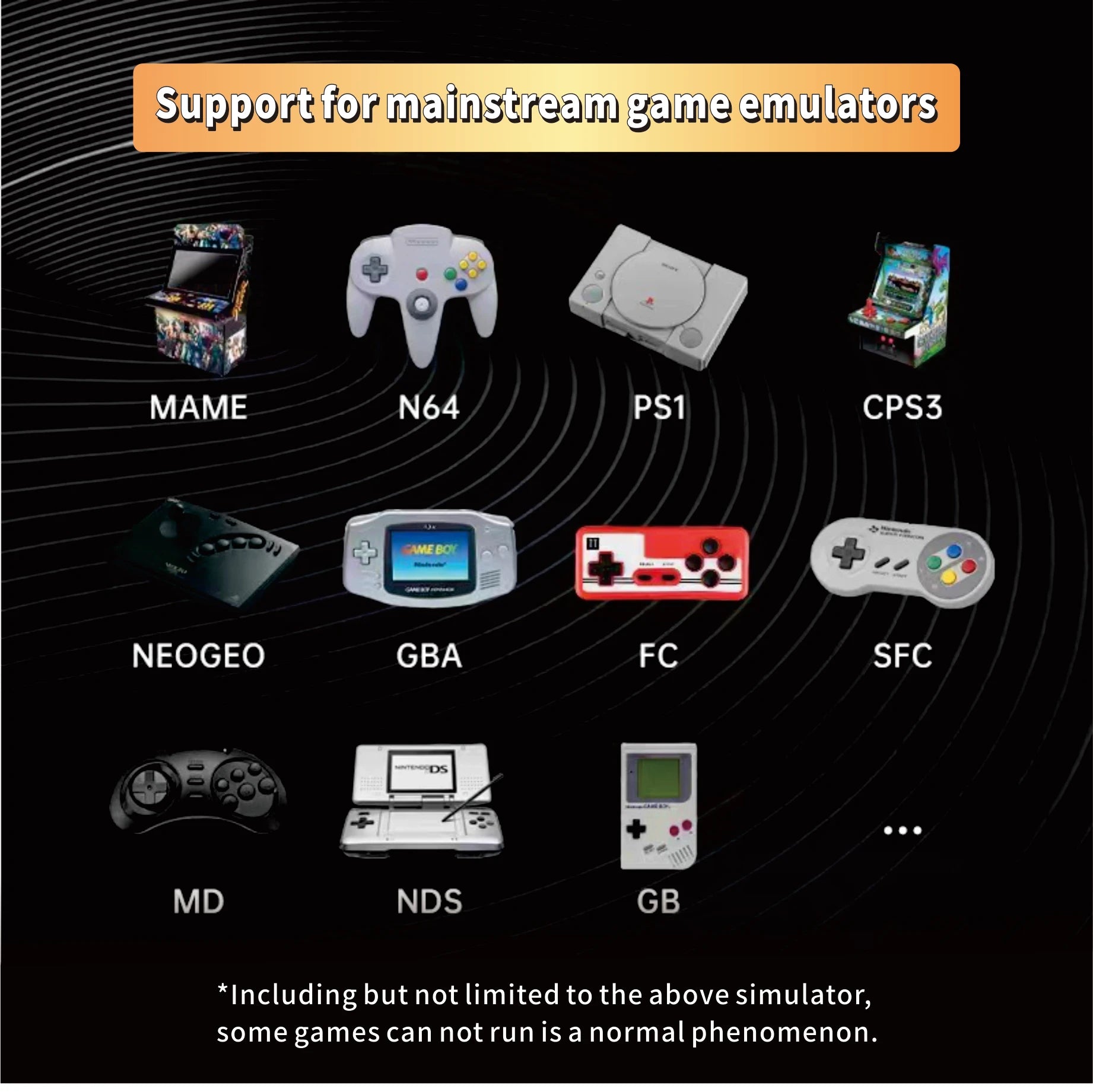 Built in simulator: supports MAME/N64/PS1/NEOGEO/GBA/FC/SFC/MD/CPS1/CPS2/CPS3/PSP, etc